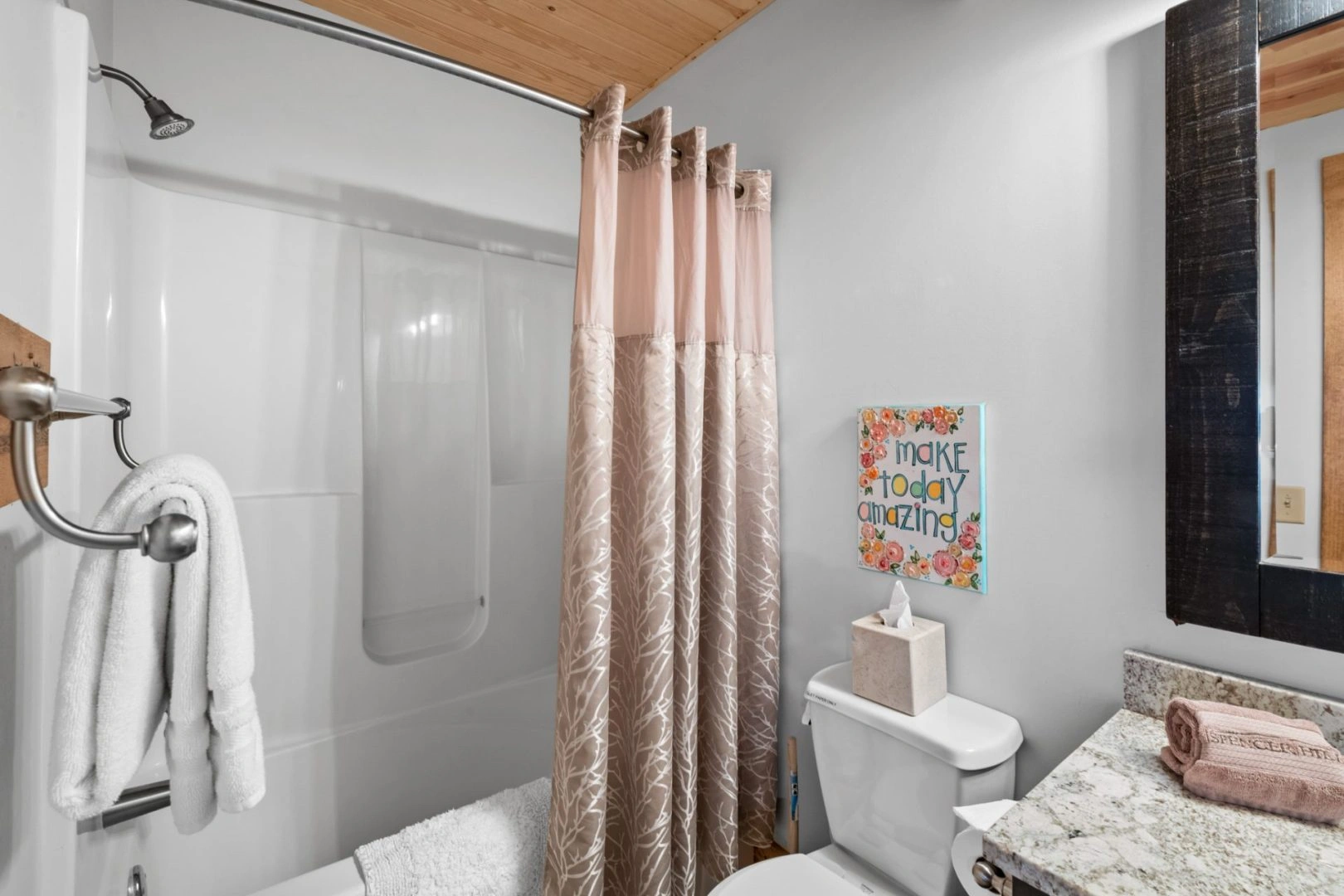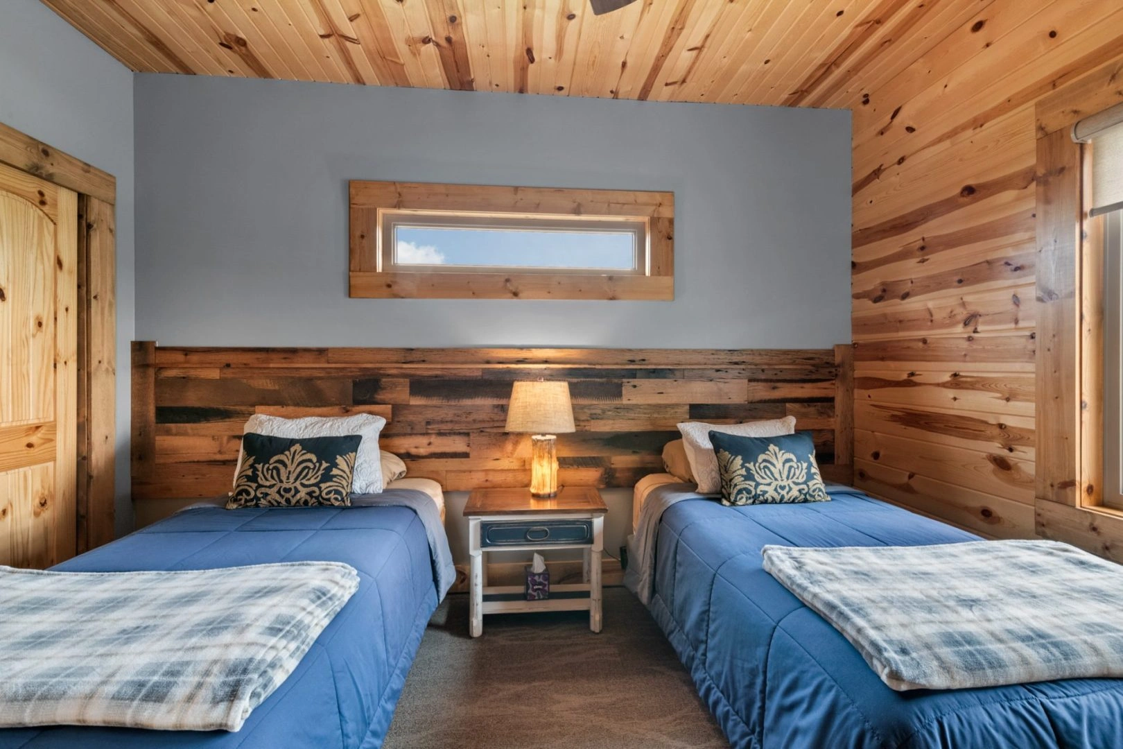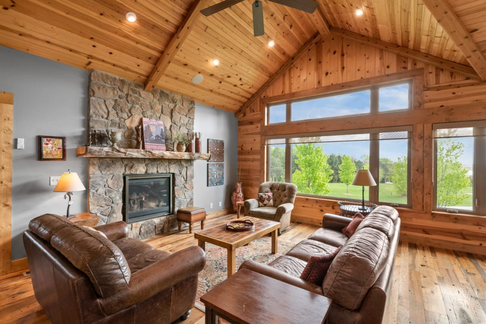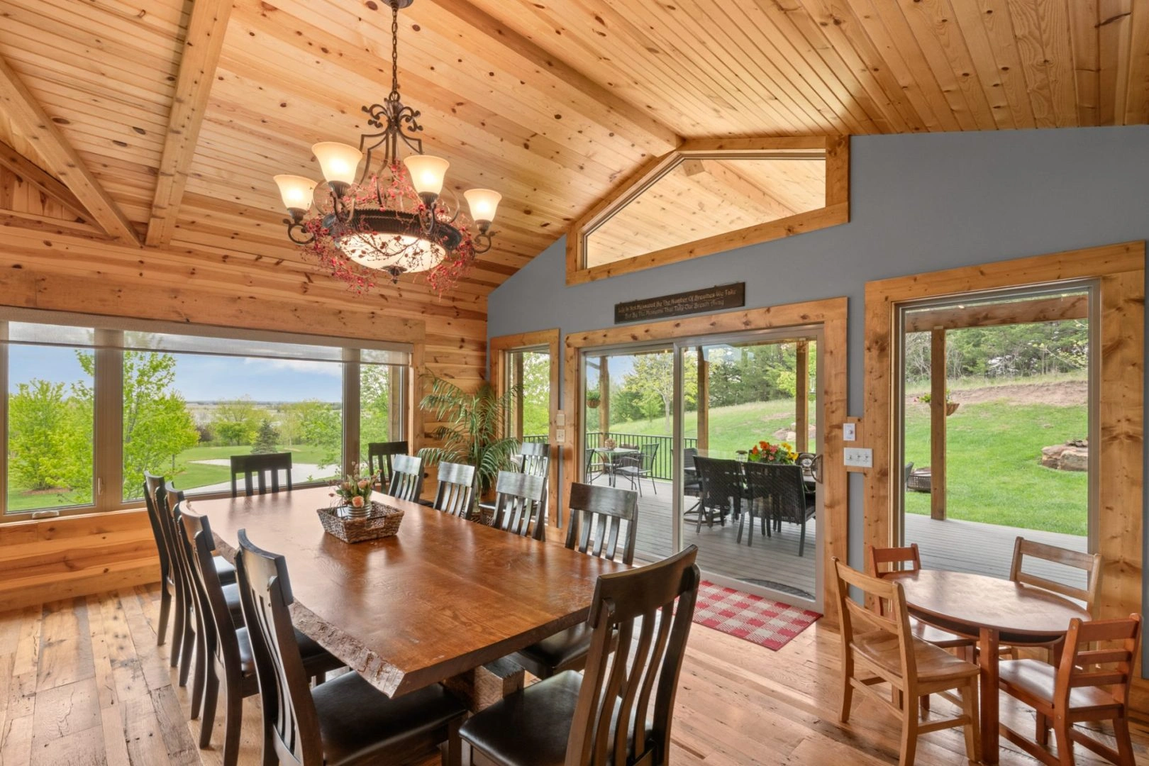 Sto-Nee Ridge is our 5 bedroom, 3 bath cabin completed in July 2018. This rustic, chic lodge will make you feel like you are in the mountains! Its knotty pine ceilings and walls give you a warm feeling the minute you walk in the door. This two-story cabin features a 2650 sq. ft. open floor plan decorated with modern/rustic furnishings, knotty pine cathedral ceilings, reclaimed antique barn wood flooring, and granite countertops. Many large windows offer fantastic views of Lake Wanahoo.