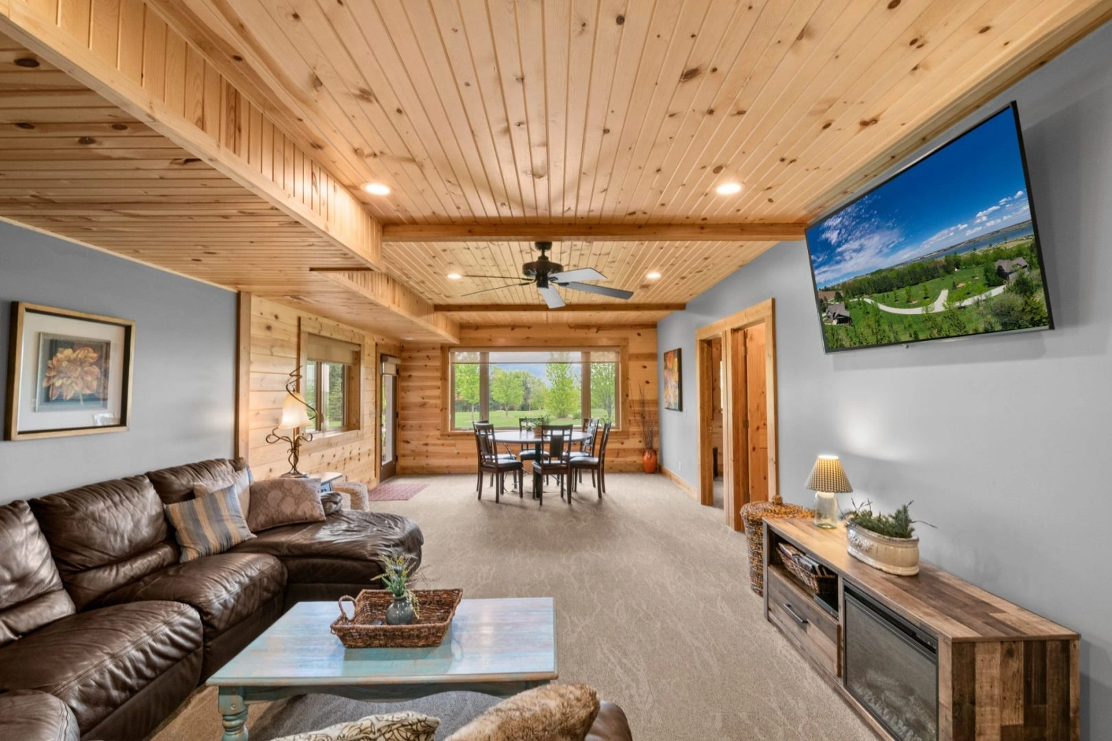 The main floor has large windows overlooking the lake. It has an open floor plan with a fully equipped kitchen and a great room with dining capacity for 12 indoors. There is a large covered deck (430 sq. ft) that adjoins the dining room with seating capacity for 20+. A leather sofa and 2 comfy chairs provide the perfect spot for reading a book in front of the fireplace. The main floor also has two bedrooms: